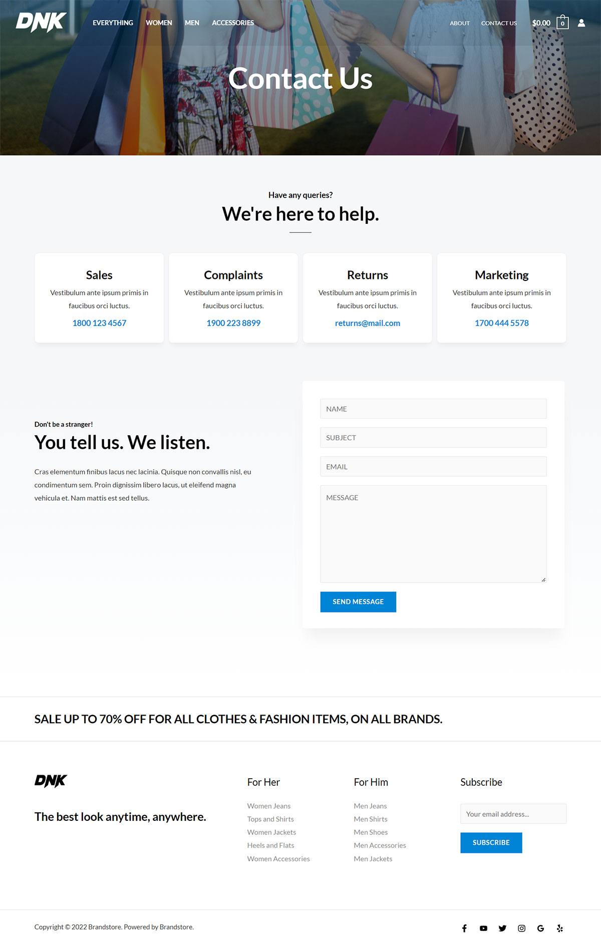 + Free ShippingFai risplendere il tuo marchio con il nostro modello di sito web Brandstore. Il modello Brandstore ha un design semplice, pulito e ottimizzato per i dispositivi mobili, che aiuta i clienti a fare acquisti da qualsiasi luogo. Il modello è progettato per integrarsi perfettamente con WooCommerce, così puoi iniziare a mostrare i tuoi prodotti in pochi minuti e accettare pagamenti online.